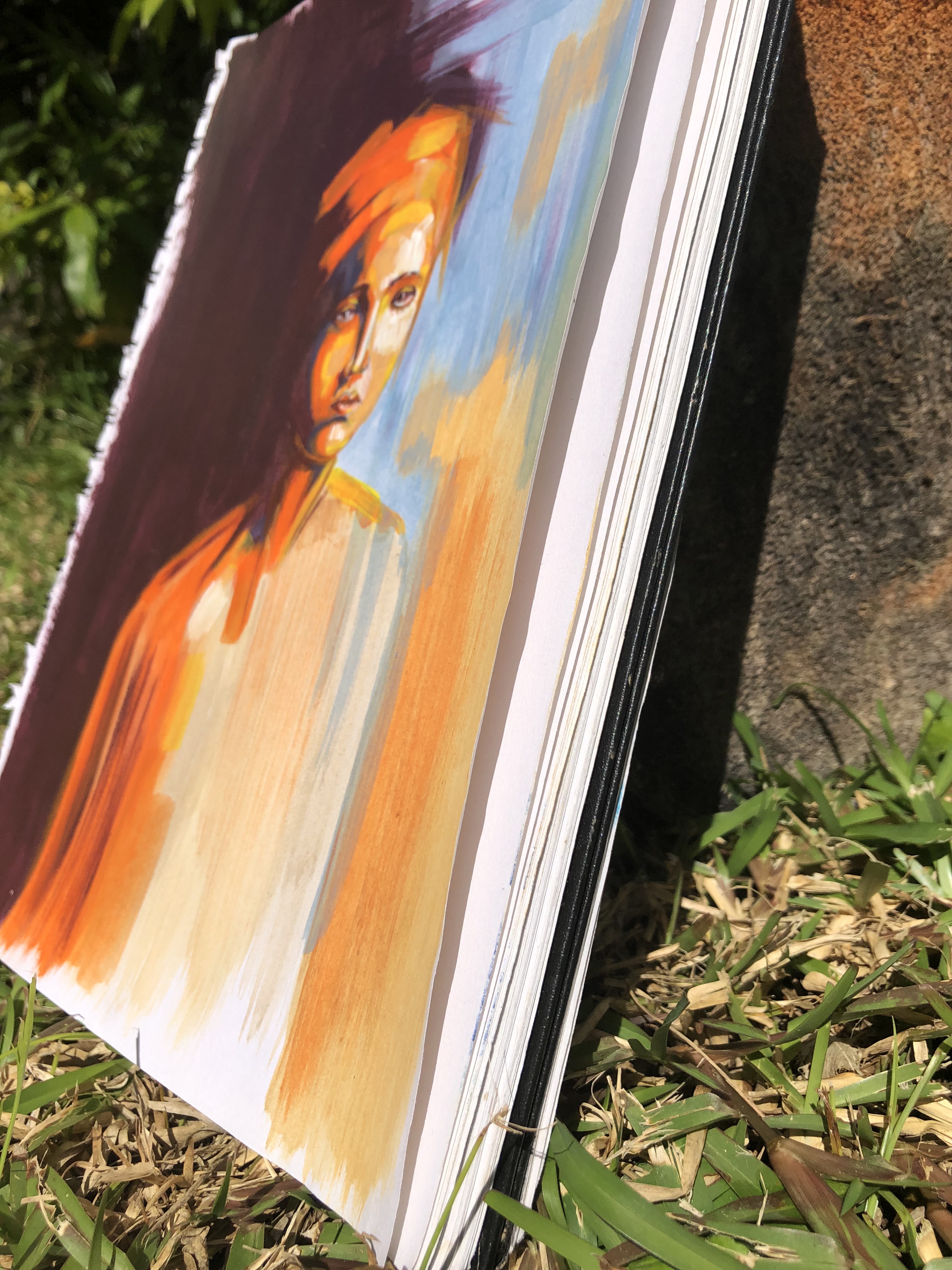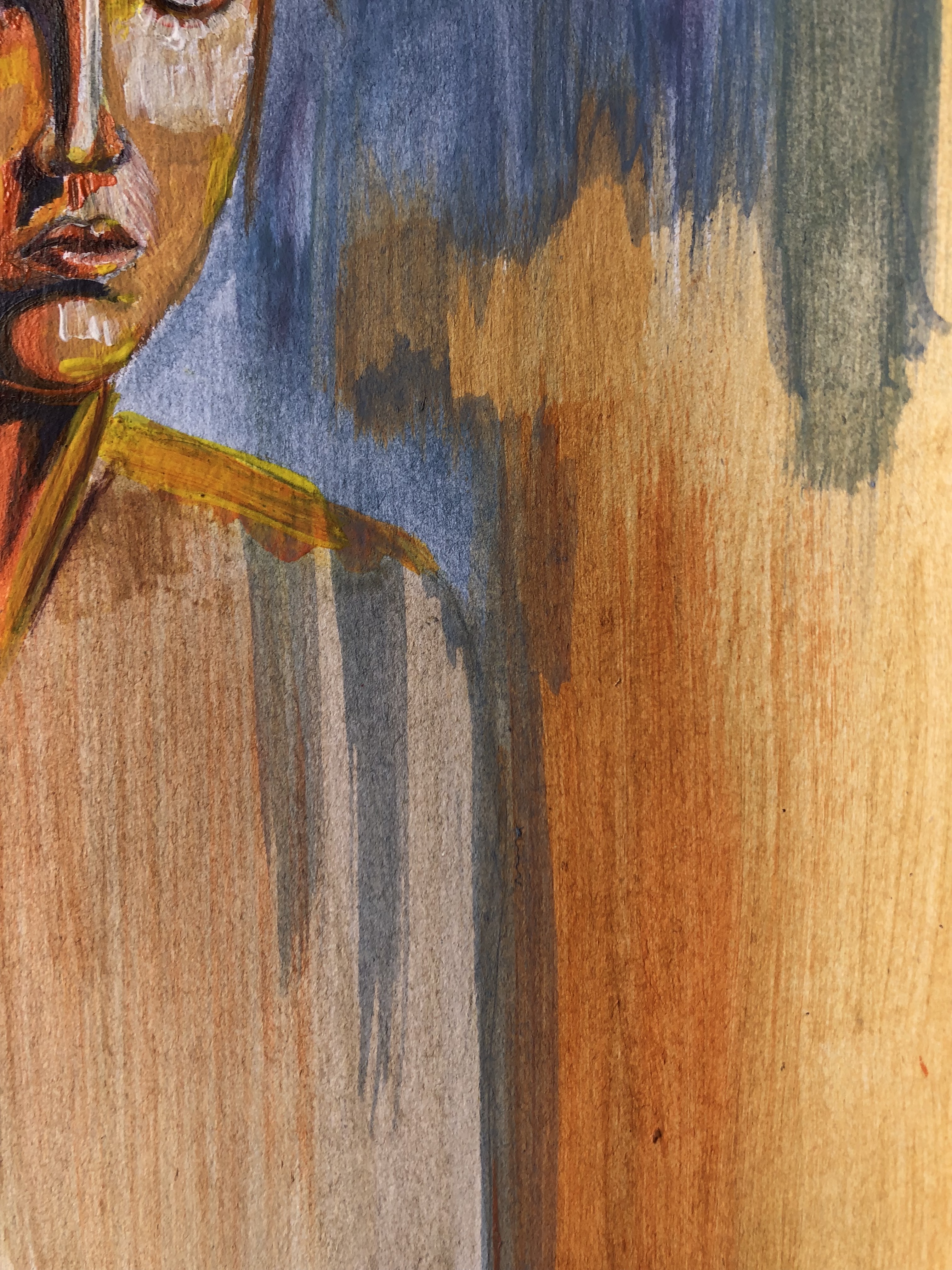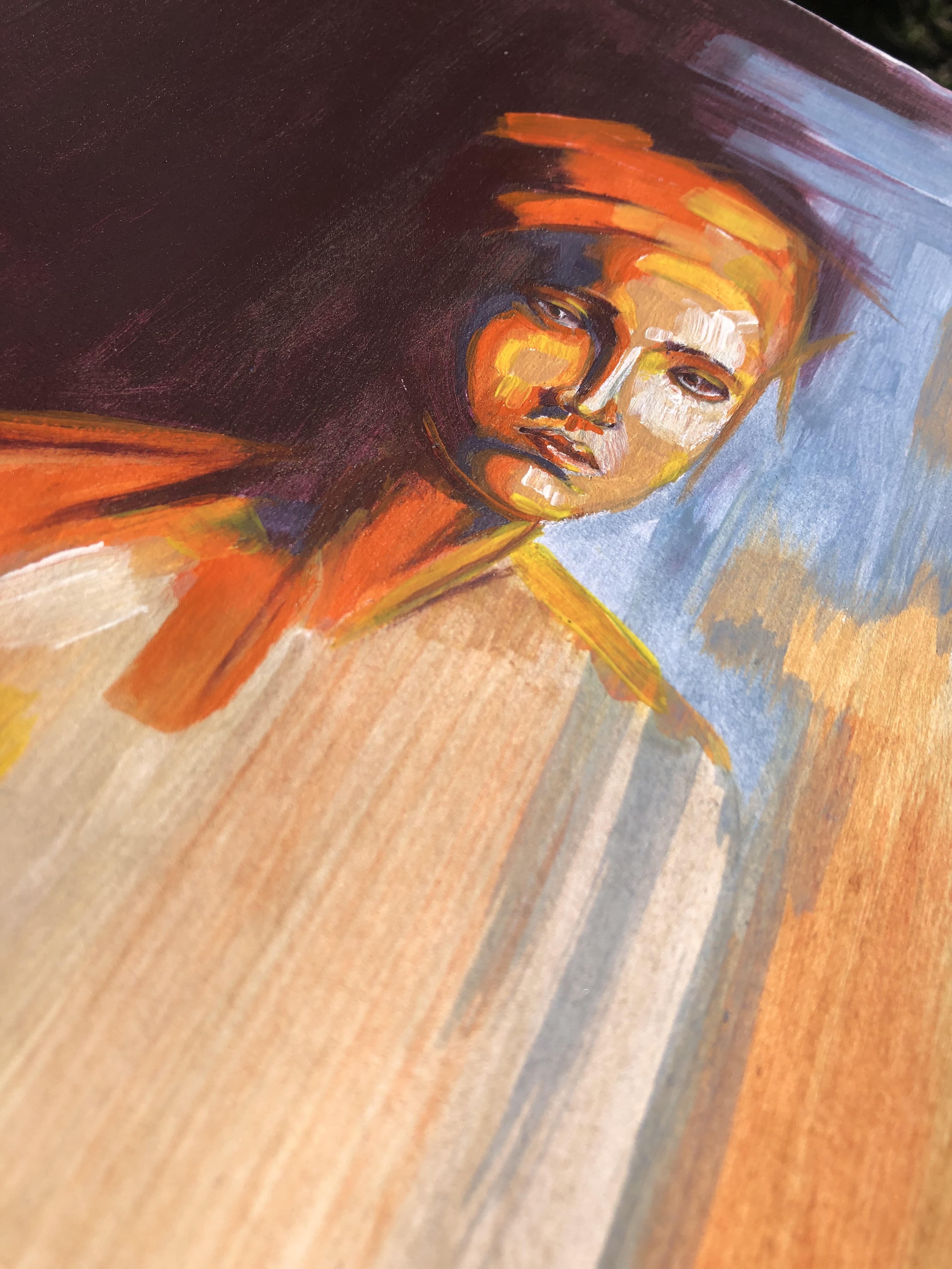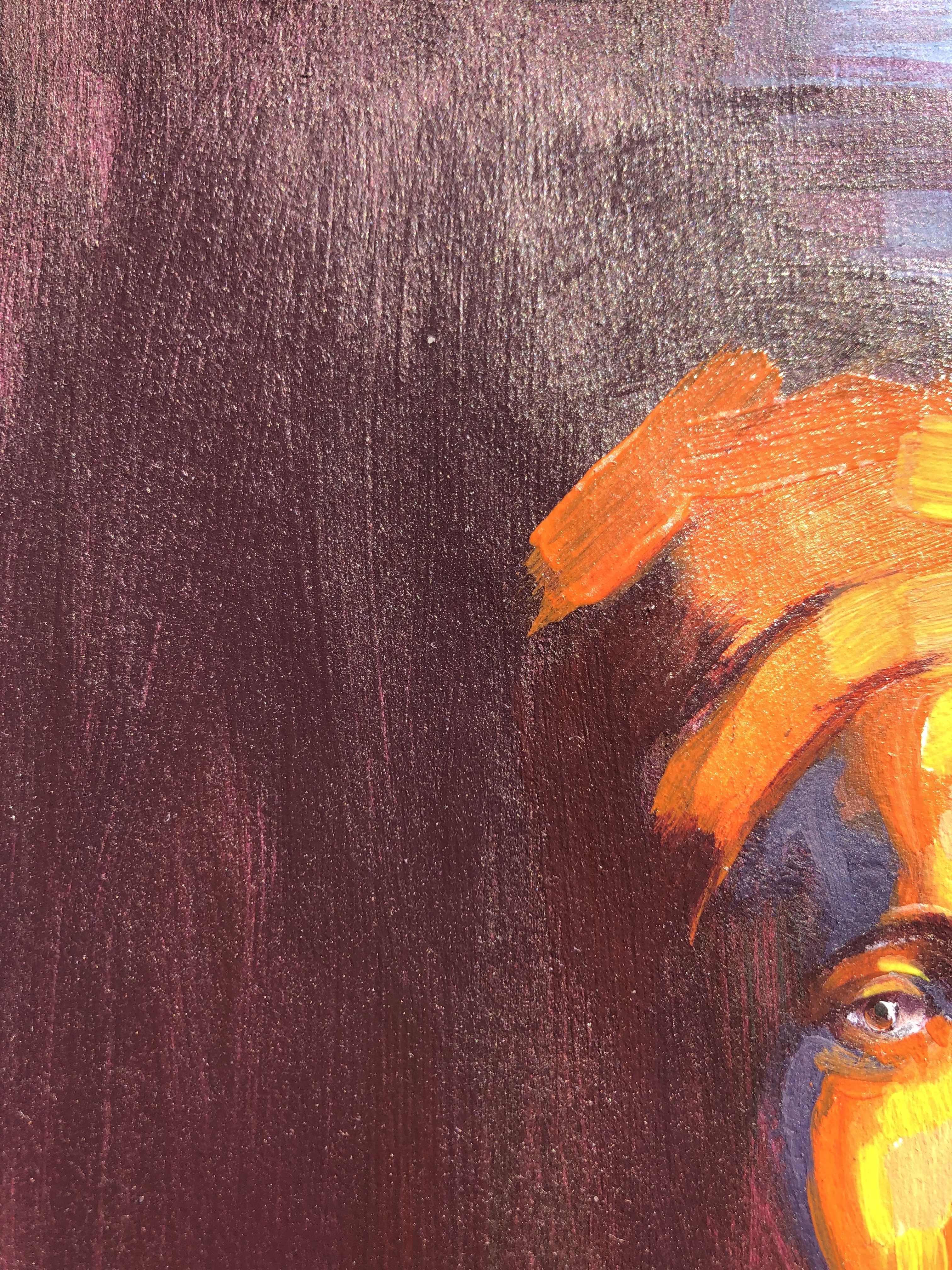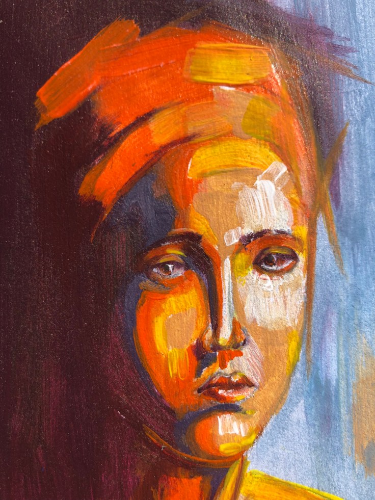 For the background, I went for a wine purple and contrasting with a sky blue and some peachy orange. Overall, I find the composition balanced and strokes in the background were well experimented to bring the colours to harmony.