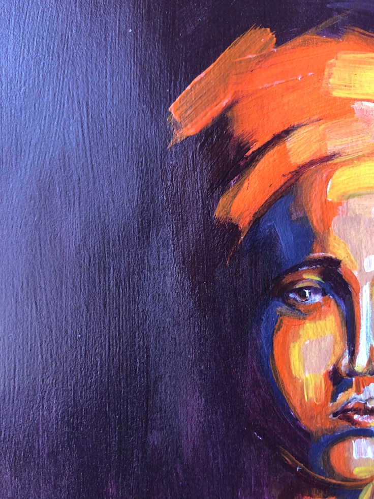 Through this artwork, I got the opportunity to demonstrate some confident stroke skills here and there with different colours showing some light and shade. Coming to colour choice, I went for a warm colour palette. For the human figure, I chose orange as a primary colour and purple for shadows and yellow and clear white for light.