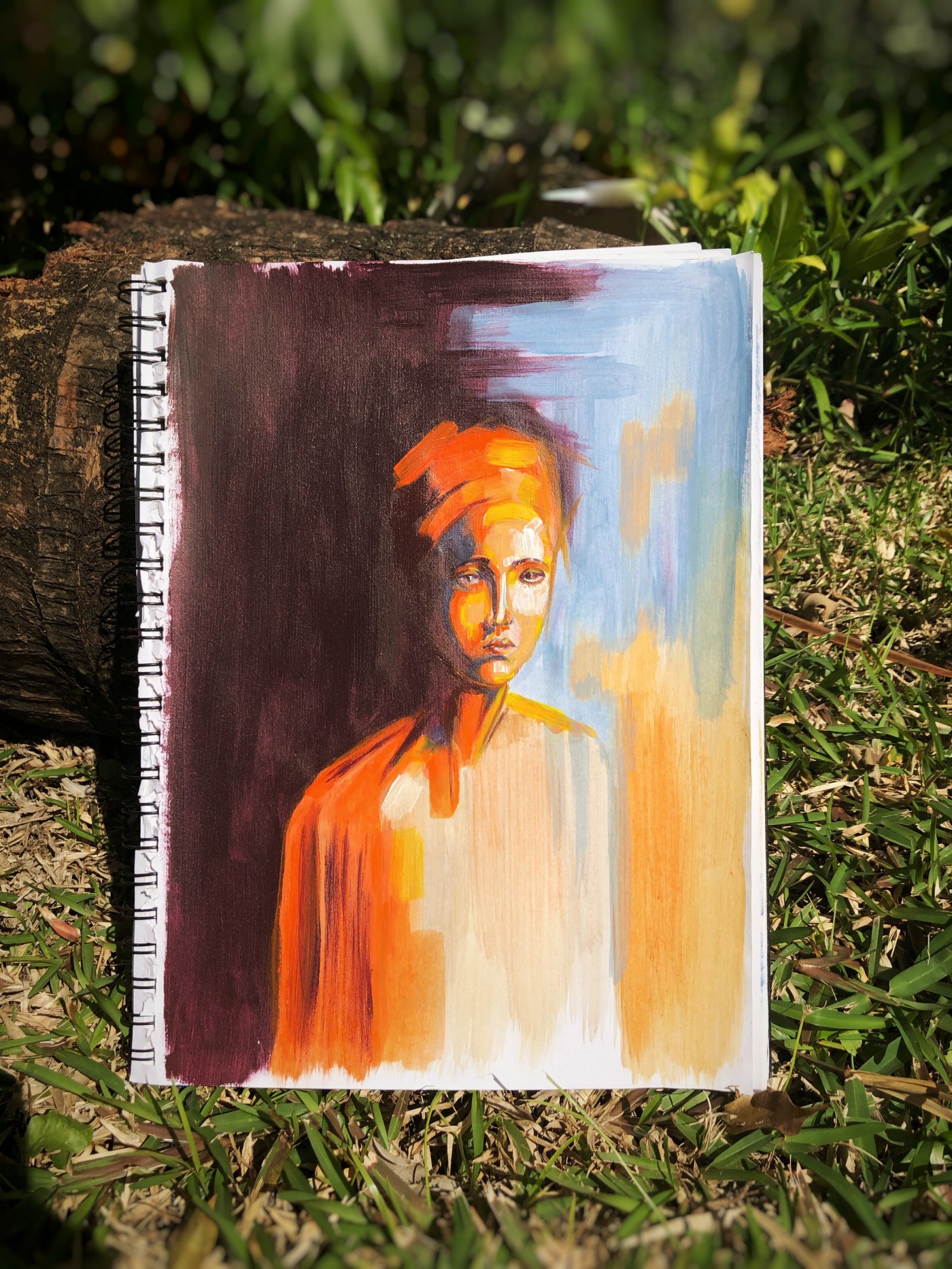 For the background, I went for a wine purple and contrasting with a sky blue and some peachy orange. Overall, I find the composition balanced and strokes in the background were well experimented to bring the colours to harmony.