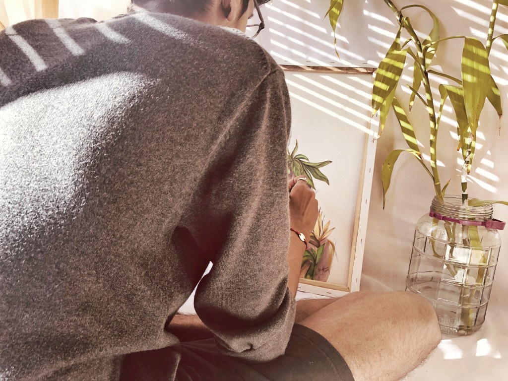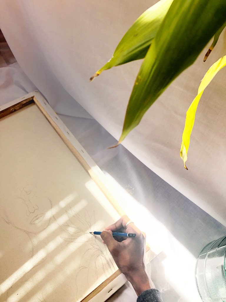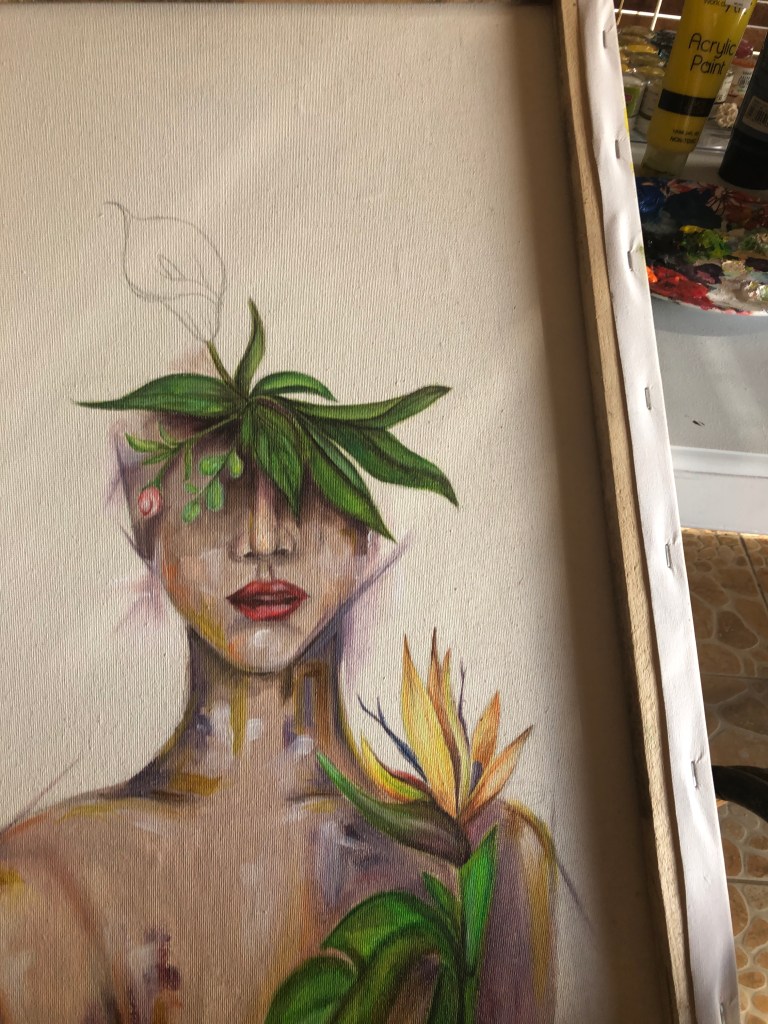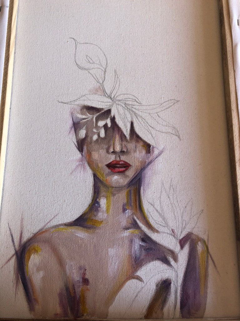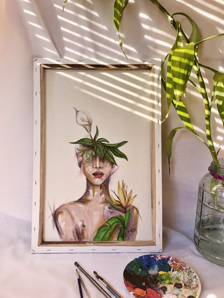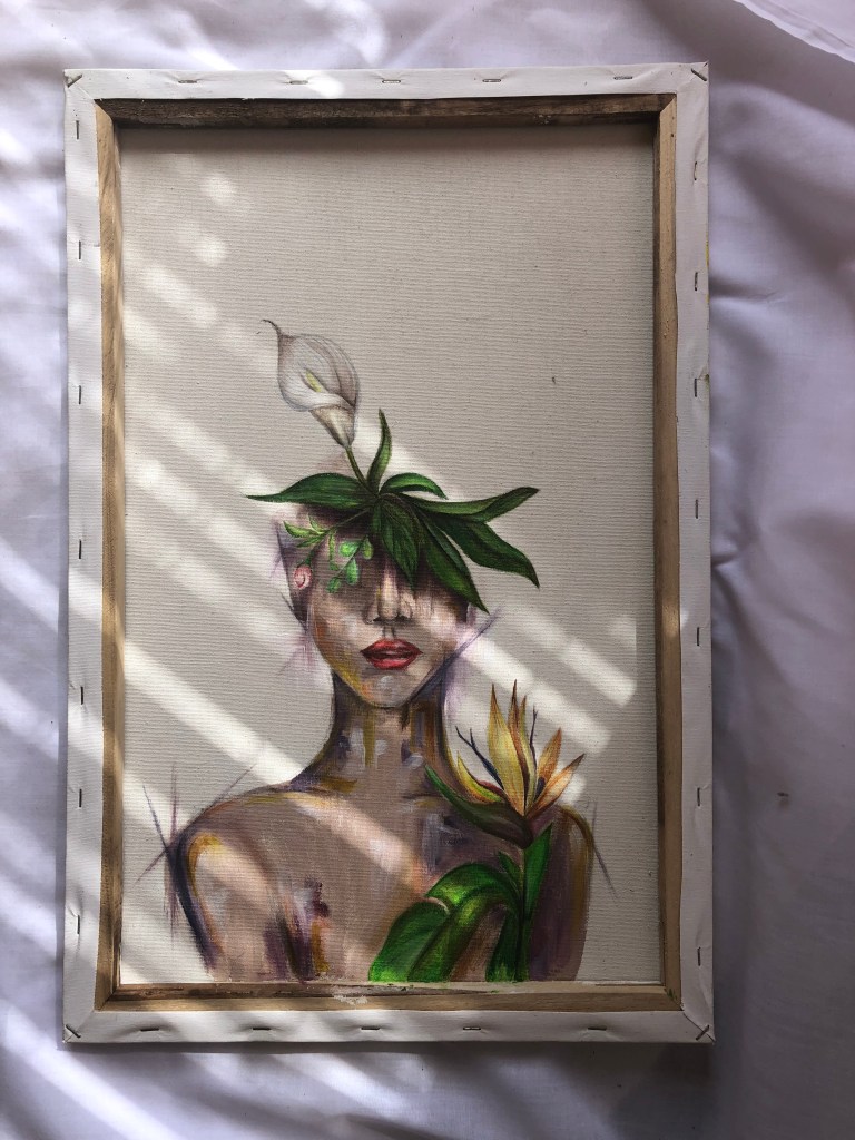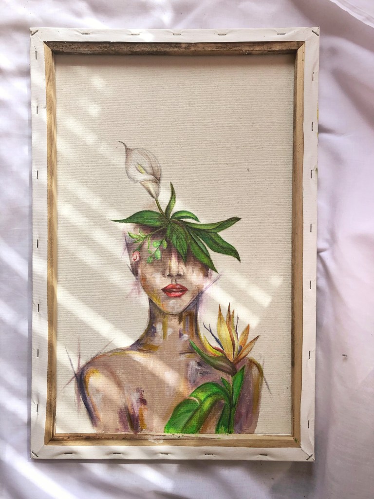 The artwork, “When Nature is the Escape”, communicates this recurrent topic; depression and mental illness. I have found that to soothe and heal oneself, the mind, soul, and heart should be in the proper environment, and that could be our green environment. After lockdown, many of us have been found to revalue and reconnect with nature. Our green surrounding has always been the spot for mental stability and self-discovery. This is an artwork not like the others, it is done on the back of the canvas representing the inner identity and the fear to speak what our thoughts are.